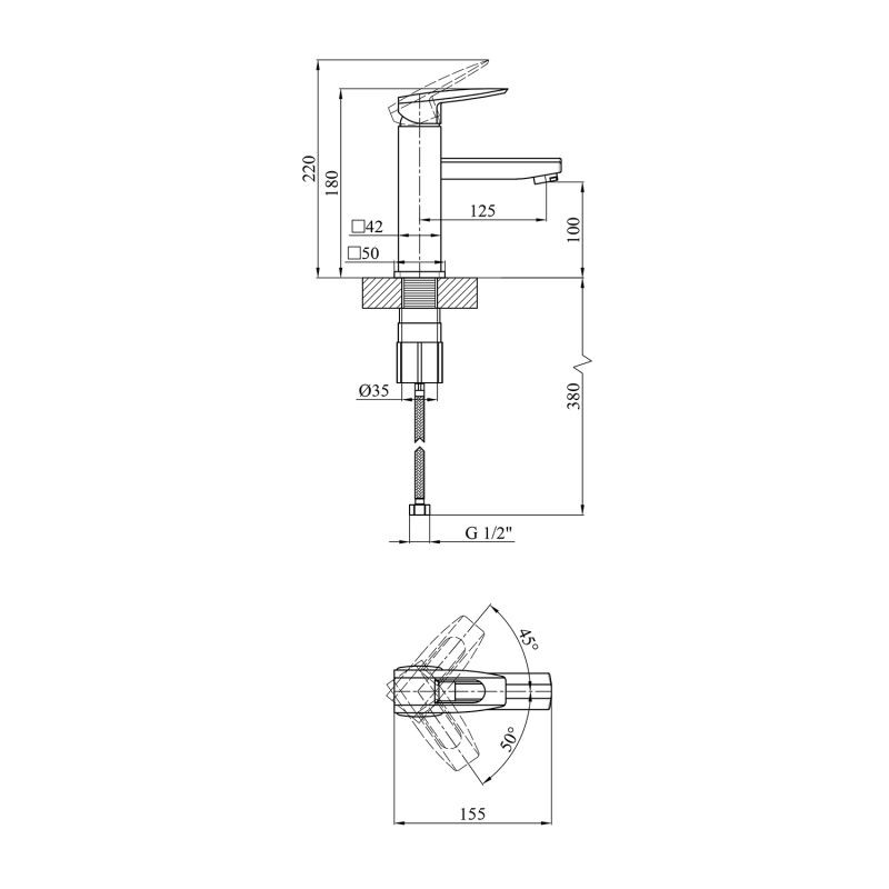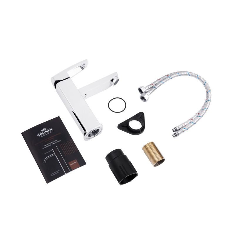 Смеситель для умывальника Kroner KRM Kante-C010 CV023579 изготовлен из силумина и имеет блестящую поверхность цвета хром. На рычаге смесителя есть отверстие, что очень удобно для использования детьми и людьми с ограниченными способностями. Смеситель устанавливается на одно отверстие и подключается с помощью гибких шлангов, которые идут в комплекте поставки.