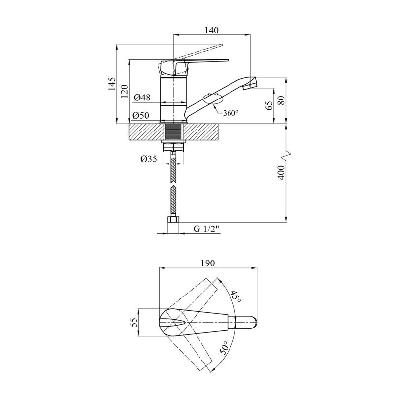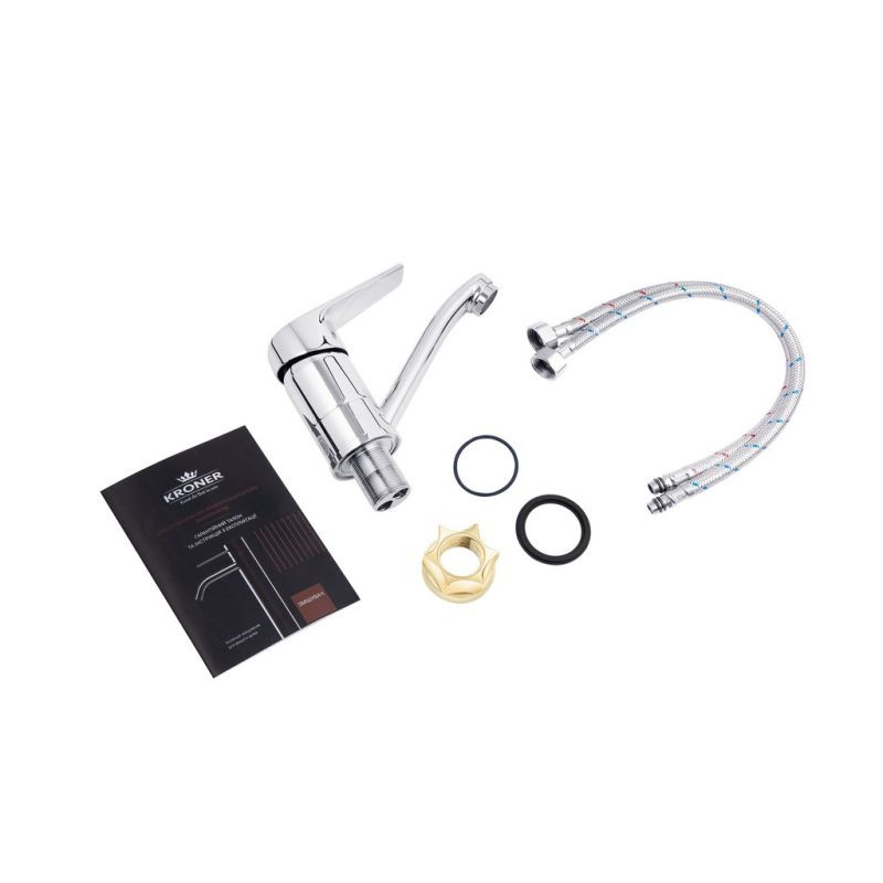 имеет гладкий хромированный корпус и выполнен из силумина. Поворотный излив смесителя придаёт ему большей функциональности в использовании с большими раковинами. Смеситель устанавливается на 1 отверстие и крепится с помощью гайки. В комплекте идут гибкие шланги подвода воды.