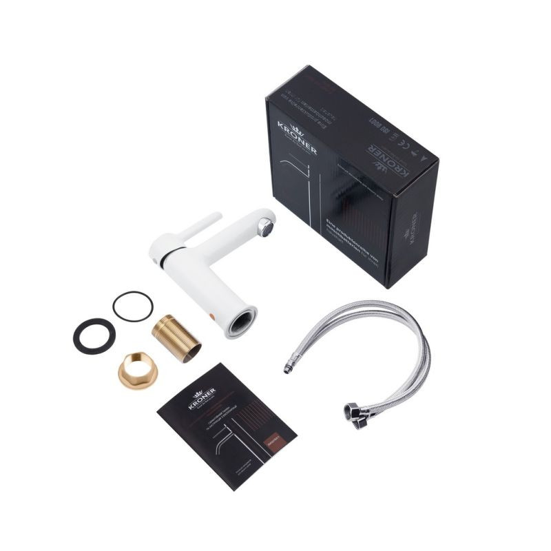 Смеситель для умывальника Kroner KRP Essen-W010 CV024323 изготовлен из латуни и имеет гладкую белую поверхность с хромированными элементами. Смеситель имеет прямой цилиндрический корпус и такой же излив со скошенным краем. Аэратор выполняет важную функцию смешивания воды с воздухом, что препятствует разбрызгиванию. Керамический картридж диаметром 35 мм обеспечивает длительный срок службы всего смесителя и сохранение плавности хода рычага.