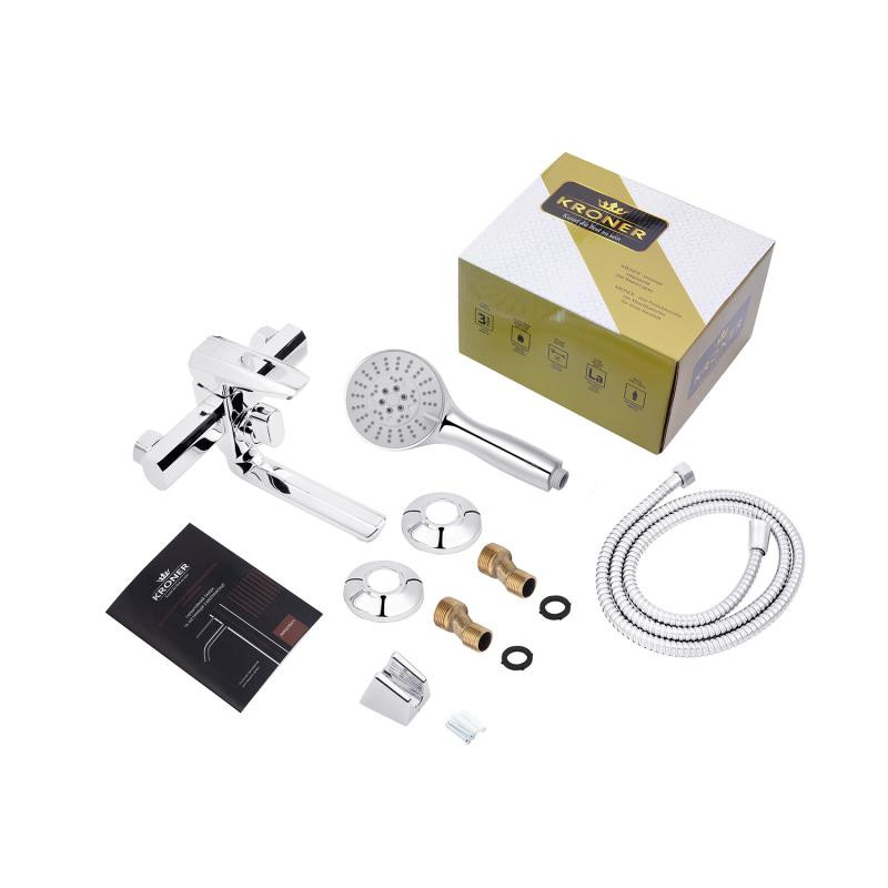 Смеситель для ванны с душевым набором Kroner KRM Kante-C060 CV023581 выполнен из силумина и имеет гладкую хромированную поверхность, за которой легко ухаживать. Излив на ванну поворотный, поэтому его легко убрать при принятии душа. Душевой набор с лейкой, шлангом и настенным держателем входят в комплект поставки. Смеситель имеет стандартное подключение с эксцентриками и декоративными розетками.