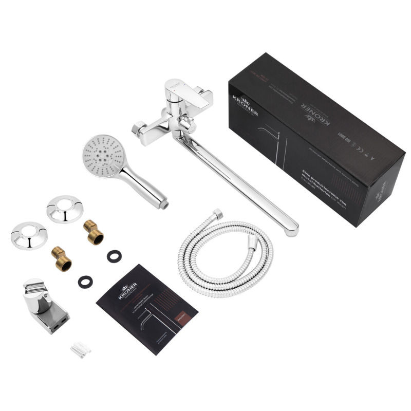 Смеситель для ванны с душевым набором Kroner KRP Eifel-C070 CV023616 изготовлен из латуни и имеет глянцевое хромированное покрытие. Длинный поворотный излив свободно двигается и убирается к стене, если вам нужно принять душ. Душевой набор также выполнен в хромированном цвете и состоит из: лейки ручного душа с тремя типами струи, душевого шланга и настенного держателя ручного душа. Таким образом вы получаете полноценный, многофункциональный смеситель для ванны, который можно устанавливать как в новое помещение, так и использовать как замену старой модели.