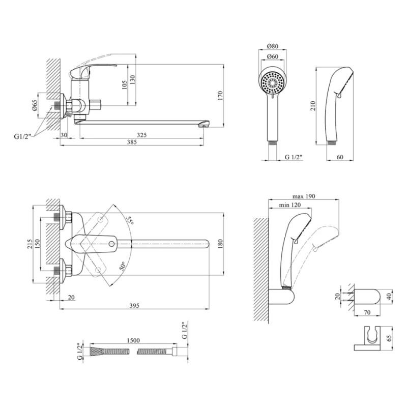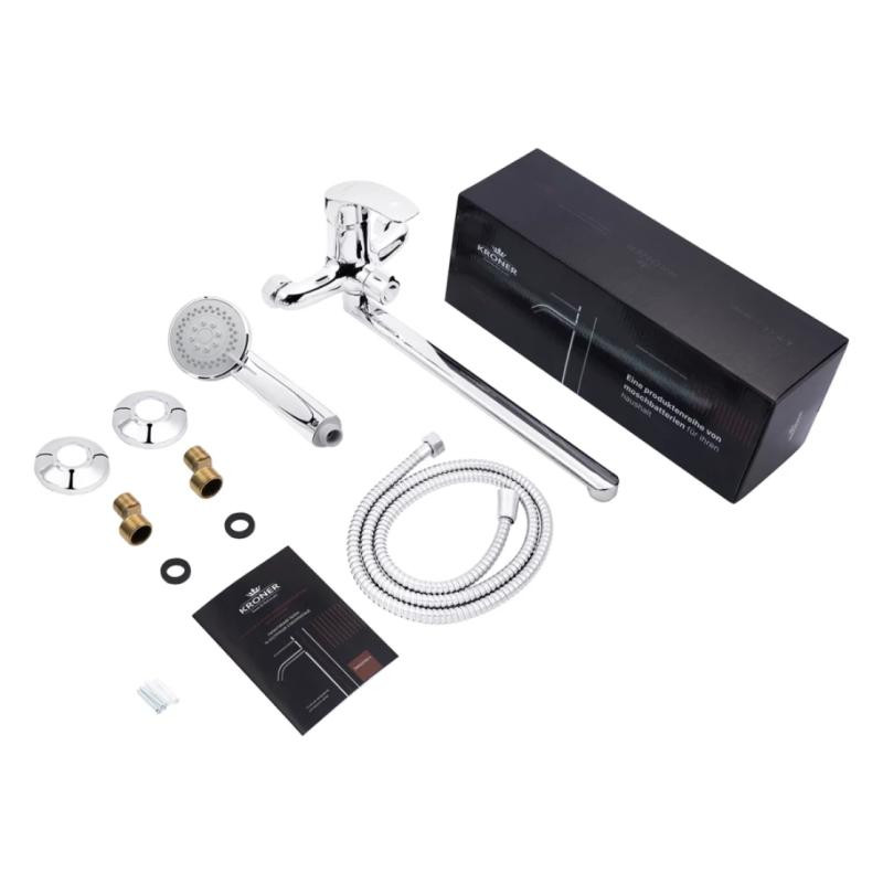 Змішувач для ванни з душовим набором Kroner KRP Konstante-C072 CV023593 виготовлений з латуні високої якості та має гладке хромоване покриття. Довгий поворотний вилив дозволяє охопити велике місце чудовим потоком води, який формується аератором. У комплекті зі змішувачем йде душовий набір до складу якого входить: ручний душ із трьома типами струменя, душовий шланг та настінний тримач. Перемикач-дивертор розташований на корпусі змішувача.