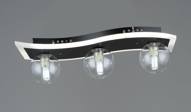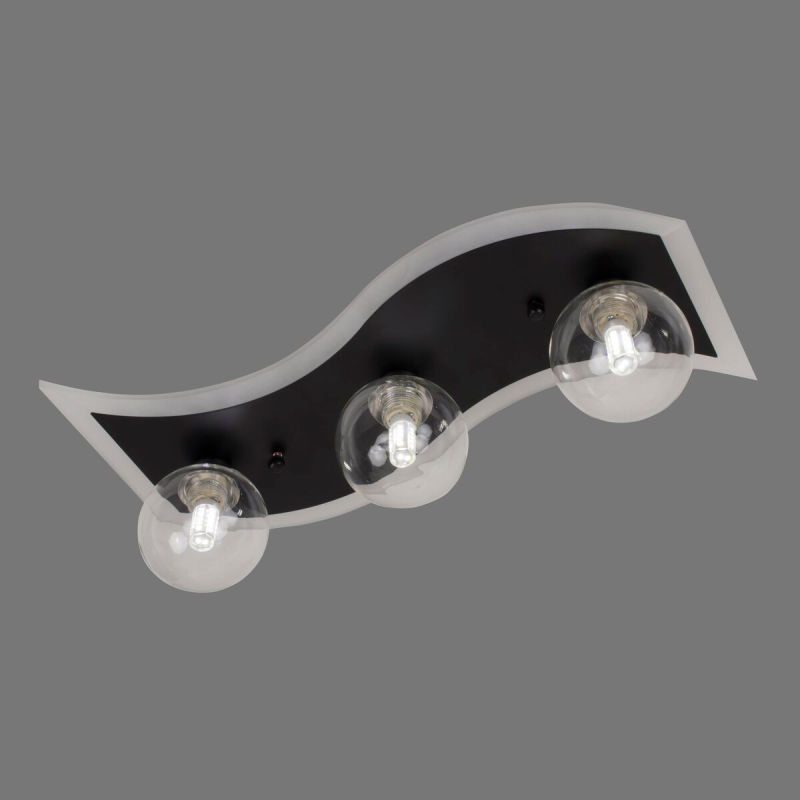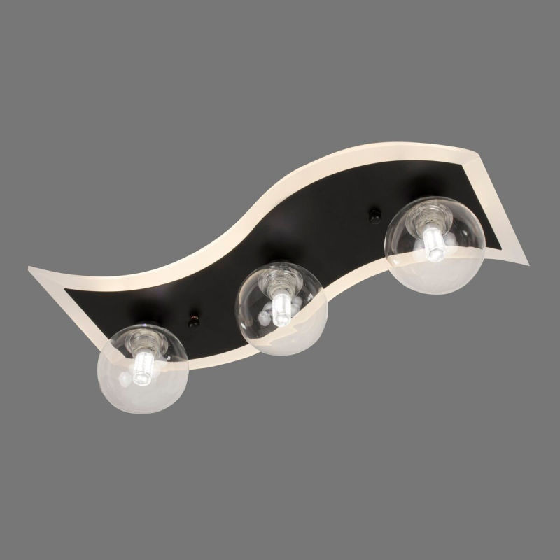 Благодаря черному металлическому каркасу, эта люстра придает вашему интерьеру современный вид. Три круглых прозрачных плафона из стекла гармонично рассеивают свет и добавляют неповторимый отблеск.