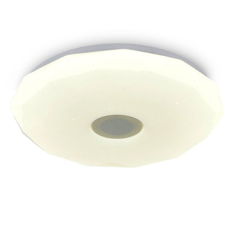 Сочетание металлического корпуса и акрилового рассеивателя обеспечивает мягкий свет без эффекта мерцания, что немаловажно для здоровья глаз. Модель оснащена встроенной Bluetooth колонкой, позволяющей воспроизводить музыку или аудиокниги со смартфона. Кроме основного белого света мощностью 32W, можно использовать цветовой режим RGB (2W) для создания особого настроения.