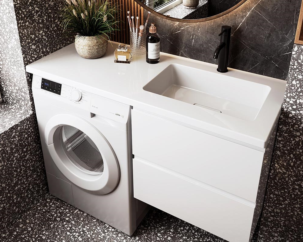 Это прекрасный вариант для размещения столешницы с тумбой рядом со стиральной машинкой. Размеры тумбы позволяют разместить стиральную машинку, которая в ходе работы будет эффективно работать и не будет мешать и касаться тумбы. Столешница позволяет разместить аксессуары и разные мелочи, что очень функционально и удобно.