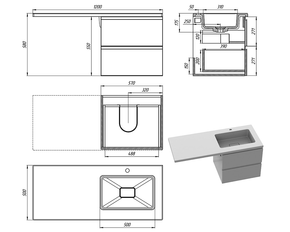 • Размеры умывальника (д*ш*в), мм    1200х500х30