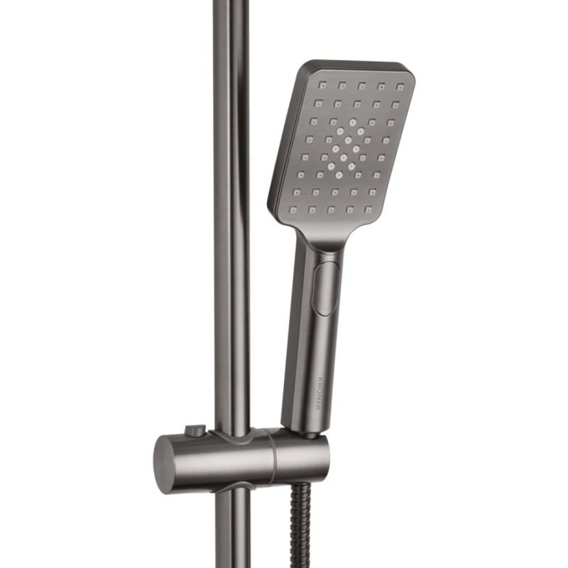 Основна увага в дизайні системи приділена прямокутному верхньому душу розміром 290x190 мм, який забезпечує повноцінний потік води, створюючи ефект м’якого дощу. Кут нахилу верхнього душу можна легко налаштувати для досягнення ідеального положення, а висота душової стійки регулюється в межах від 820 до 1350 мм, що дозволяє кожному члену сім’ї вибрати комфортну висоту для прийняття душу.