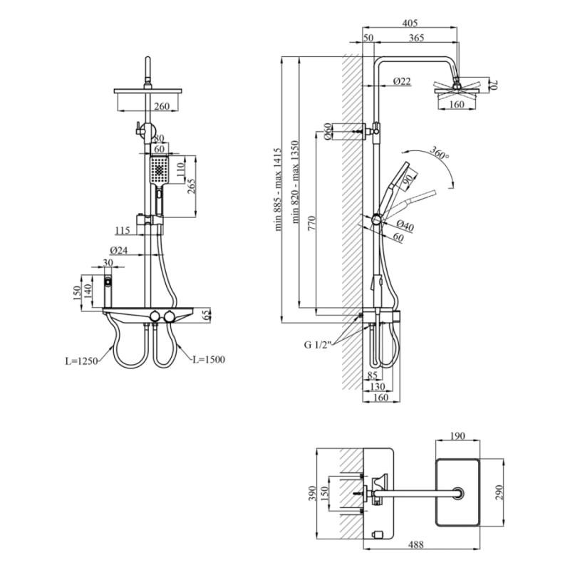 Душова система має компактні розміри, що дозволяє легко інтегрувати її в будь-який інтер'єр ванної кімнати: висота – від 885 до 1415 мм, ширина – 390 мм, глибина – 488 мм.