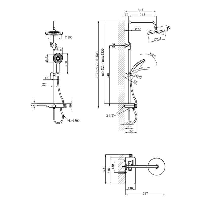 Верхній і ручний душі мають круглу форму, що забезпечує гармонійний зовнішній вигляд. Діаметр верхньої лійки становить 225 мм, а ручної — 125 мм, що створює оптимальний потік води для комфортного прийняття душу. Висота душової стійки регулюється від 820 до 1350 мм, що дозволяє налаштувати її під потреби користувача. Довжина душового шлангу становить 1500 мм, що забезпечує свободу рухів, а кронштейн для верхнього душу має довжину 365 мм. Злив довжиною 115 мм робить систему ще більш функціональною.