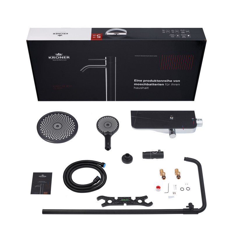 Душова система Kroner KRP Armada - SCH065 — це сучасне та функціональне рішення для стильної ванної кімнати. Система керується вентилями, що забезпечує точний контроль напору води. Ручний душ має п’ять режимів струменя, останній з яких дозволяє перекривати воду, що робить користування більш зручним і безпечним. Верхній душ оснащений одним режимом для м’якого і рівномірного потоку.