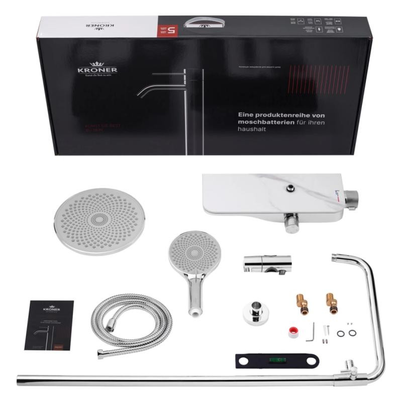 Душова система Kroner KRP Armada - W065 — це ідеальне рішення для тих, хто шукає функціональність і стиль у ванній кімнаті. Управління системою здійснюється за допомогою вентилів, що гарантує простоту у використанні. Верхній душ оснащений одним режимом струменя, а ручний душ — п’ятьма, останній з яких перекриває воду, що підвищує зручність і безпеку.