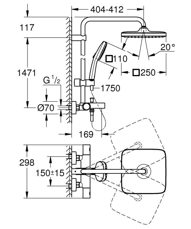 Система для настінного монтажу складається з верхнього душу 250x250 мм, ручного душу 110x110 мм, термостата для ванни, душової штанги з поворотним тримачем довжиною 390 мм і ковзним елементом для регулювання ручного душу, а також шланга довжиною 175 мм з функцією TwistStop. Верхній душ пропонує ніжний, розслаблюючий дощовий струмінь. Ручний душ оснащений силіконовим кільцем ShockProof, що захищає його від падіння та ударів. Він має два режими струменя: м'який дощ і потужний спрямований струмінь. Доступ до обох режимів легко отримати завдяки інноваційному перемикачу GROHE SmartSwitch, розташованому на задньому боці душової лійки.