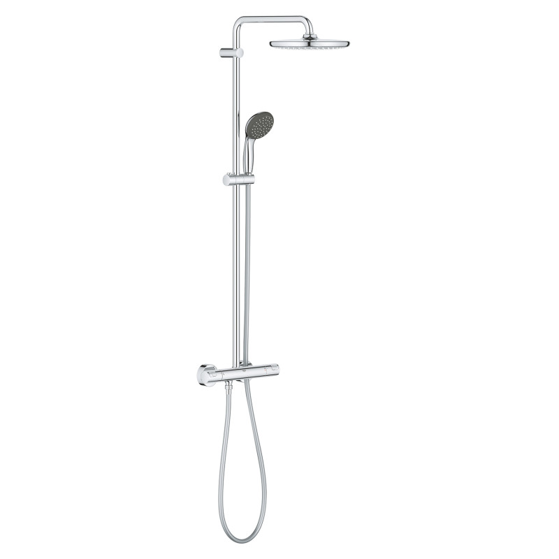 Душова система Grohe QuickFix Vitalio Start 250 26816000 є ідеальним способом оновити вашу ванну кімнату завдяки вибору режимів струменю, більшій душовій площі та всім перевагам зручності та комфорту, які пропонує термостат. Розроблена для встановлення на стіні, ця відкрита душова система включає верхній душ Vitalio Start 250, ручний душ Vitalio Start 100, термостат, душову стійку з поворотним душовим кронштейном 390 мм і ковзний елемент для регулювання ручного душа, а також 1750 мм VitalioFlex Comfort Twistfree шланг.