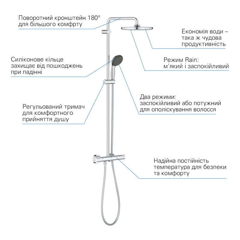 Верхній душ діаметром 250 мм створює простору зону для душу та має привабливий тонкий профіль. Режим розпилення — ніжний, освіжаючий Rain Spray. Ручний душ діаметром 100 мм був розроблений із вбудованим силіконовим кільцем ShockProof для захисту від падінь і ударів. У ручному душі є 2 режими струменю на вибір – м’який дощ і потужний цілеспрямований струмінь. Обидва душі мають водозберігаюч у функцію GROHE EcoJoy – обмеження витрат до 9,5 л/хв у верхньому душі та 5,7 л/хв у ручному душі – для зменшення споживання води, але такої ж чудової продуктивності. Технологія GROHE DreamSpray забезпечує рівномірний потік із кожної форсунки, що забезпечує ще більше задоволення. Форсунки SpeedClean на душі можна очистити від вапняного нальоту легким рухом пальця.