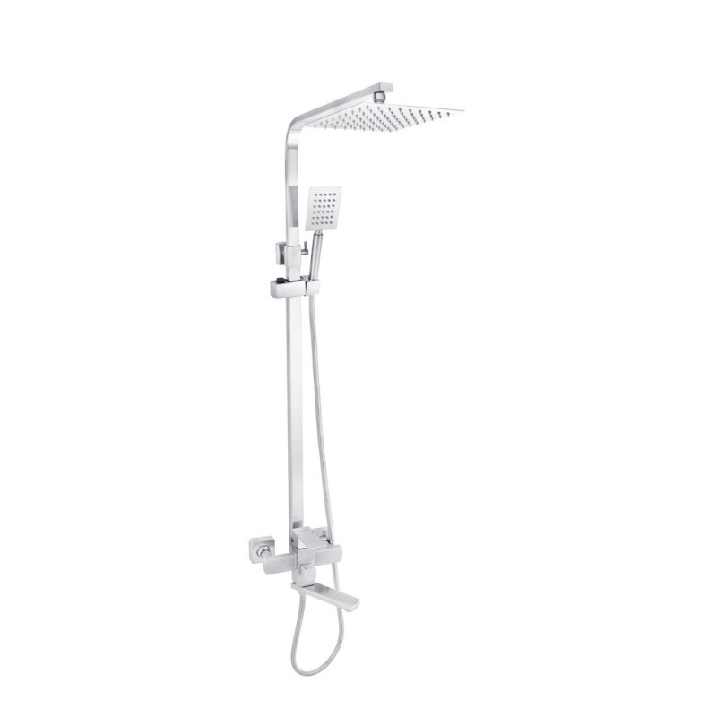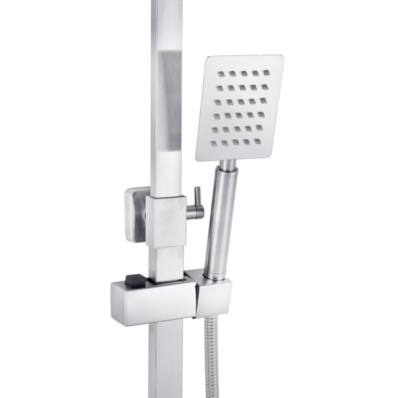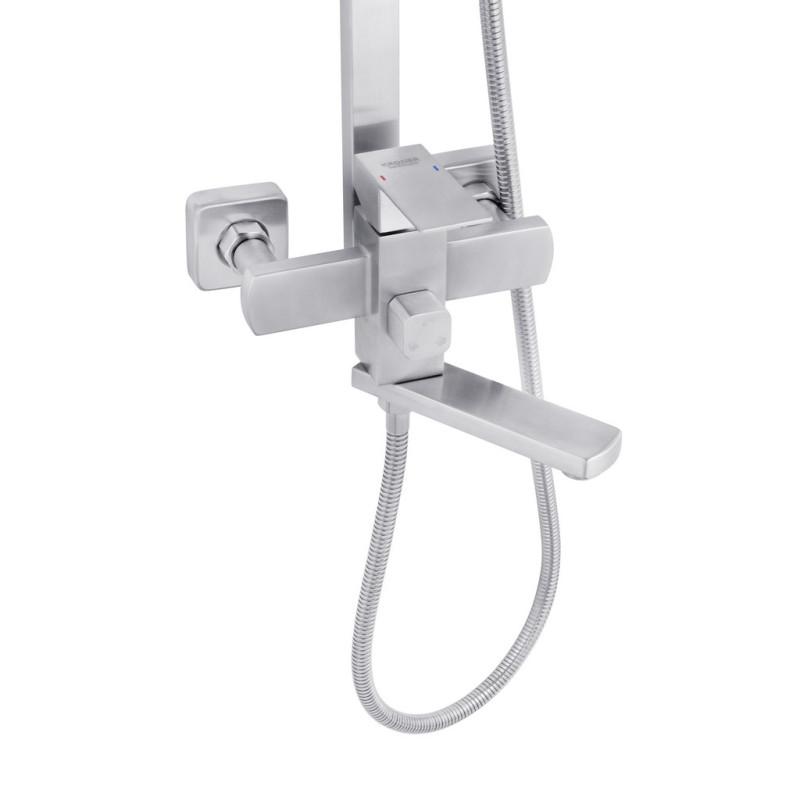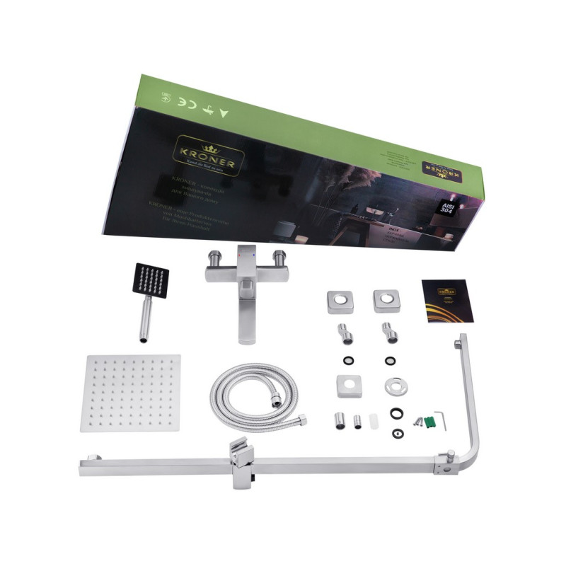 Душова система Kroner KRP Edelstahl Kubus-ESG063 CV022978 виготовлена з високоякісної нержавіючої сталі та має покриття кольору нікель. Верхній душ має квадратну форму розміром 20х20 см, а ручний душ 10х8 см із одним режимом струменя. Перемикач з поворотного виливу на верхній або ручний душ знаходиться з фронтального боку одноважільного змішувача. Чудова модель для квартир або будинків з невеликими ванними кімнатами, де є можливість встановити тільки ванну, а в сім'ї є любителі прийняти повноцінний розслаблюючий душ.