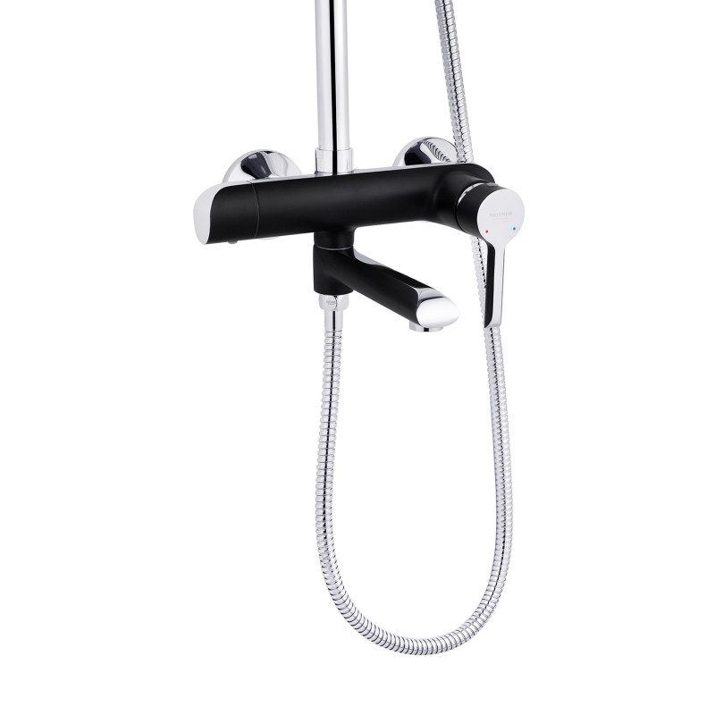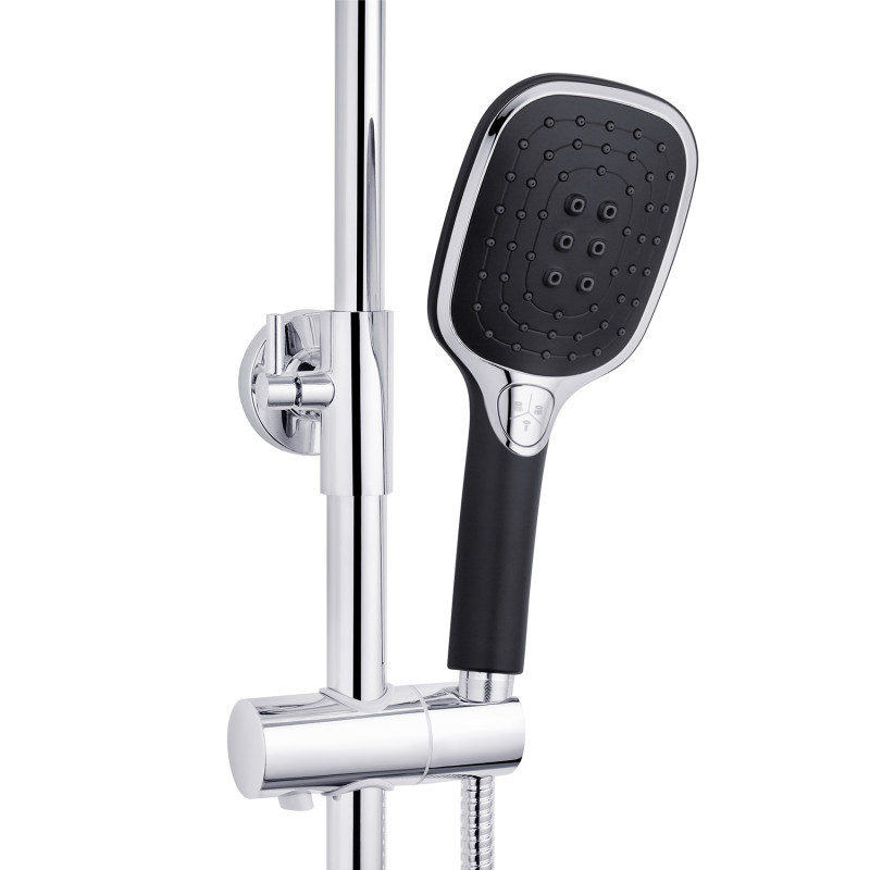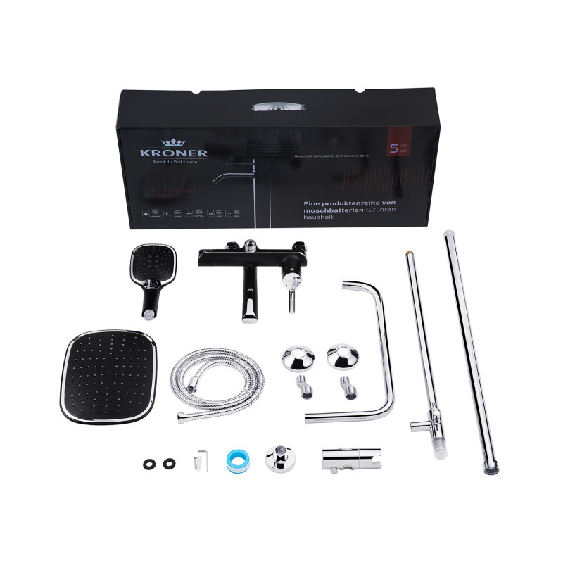 Комплектація | Змішувач, кронштейн для верхнього душу, лійка для верхнього душу, кронштейн для ручного душу, лійка для ручного душу, душовий шланг, душова стійка, кр |