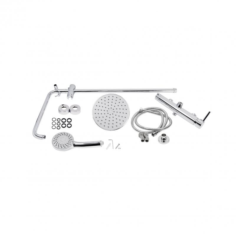 Комплектація - Змішувач, кронштейн для верхнього душу, лійка для верхнього душу, кронштейн для ручного душу, лійка для ручного душу, душовий шланг, душова стійка, кріпильні деталі.