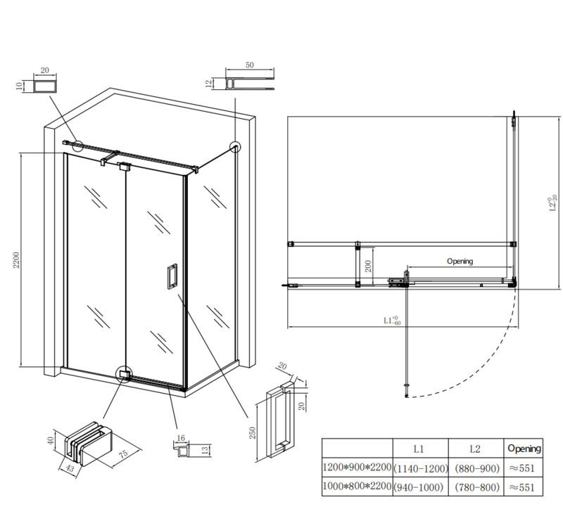 Комплектація Упаковка 1/1. Фіксовані скляні панелі-2, скляні двері-1, настінні профілі, подвійна верхня опорна планка, нижня тягова планка для дверей, ручка, комплект петель, комплект кріпильних деталей, набір ущільнювачів, заглушки.