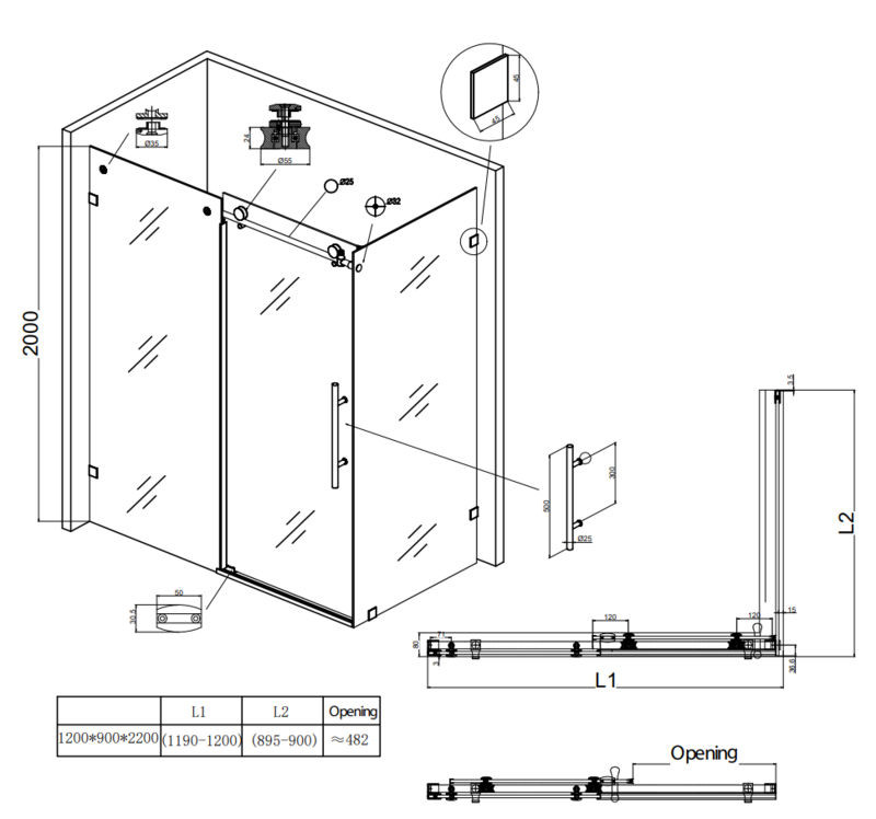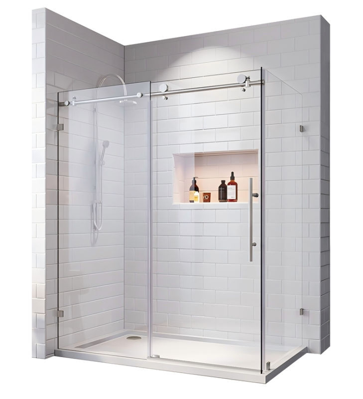 Комплектація Упаковка 1/1. Фіксовані стінки — 2, скляні двері — 1, настінні затискачі, верхня рейка, нижня водонепроникна планка, ручка, верхні ролики, система нижніх повзунків, комплект кріпильних деталей, набір ущільнювачів, заглушки.