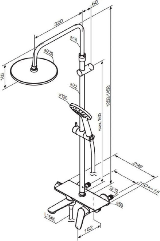 • Регульована висота душової стійки, мм: 1050 - 1450