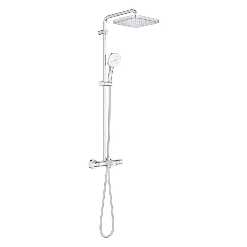 Душова система з термостатом GROHE Tempesta Cube 250 26975001 з хромованим покриттям - чудовий душ зі стабільною температурою і має вилив, що іноді необхідно в душових кабінах. Система настінного монтажу складається з верхнього душу на 250 мм, ручного душу 110 мм, термостата для ванни, душової стійки з поворотним на 390 мм кронштейном і тримачем ручного душу, що регулюється, а також шланга 1750 мм з функцією TwistStop.