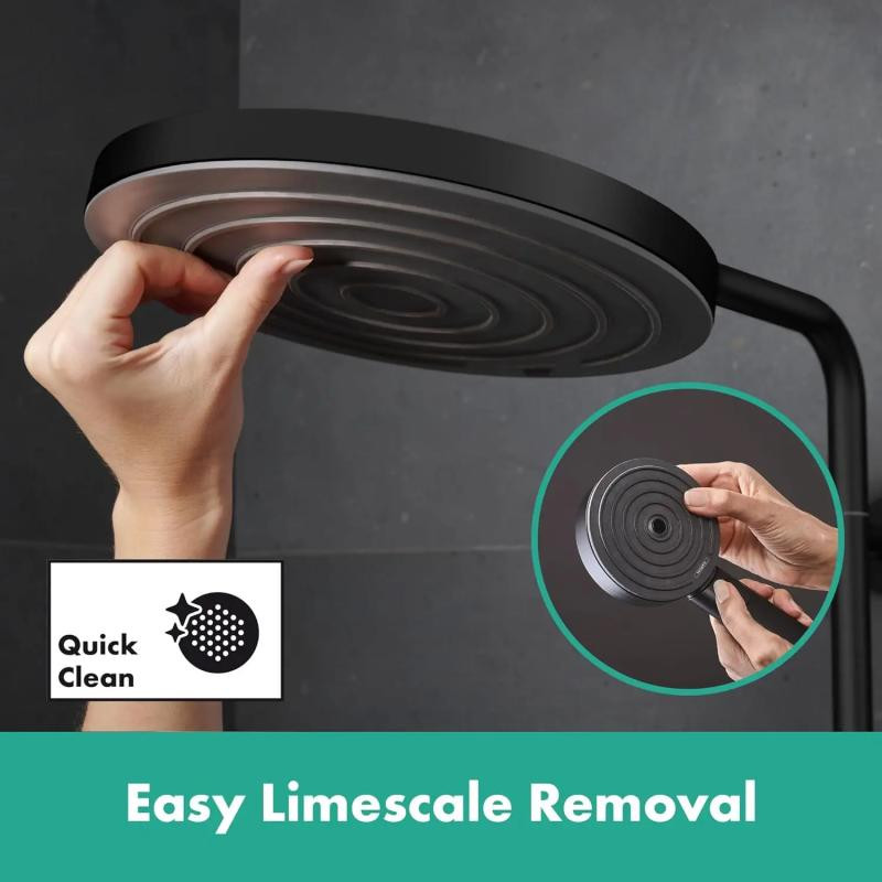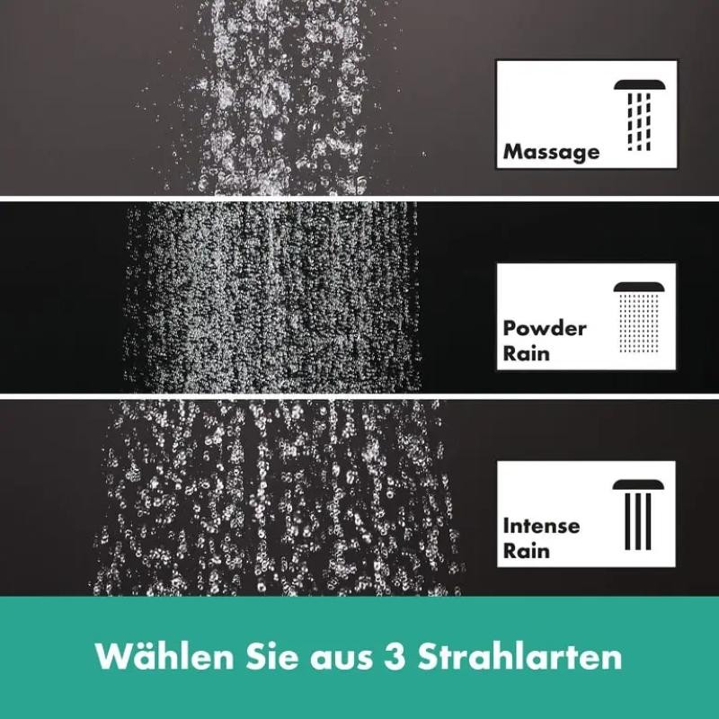 Верхній душ Pulsify 260 1jet з діаметром 260 мм забезпечує ніжний потік PowderRain, що створює відчуття м'якого дощу. Завдяки системі Fast Drain вода швидко стікає з душової головки, залишаючи її сухою і чистою.