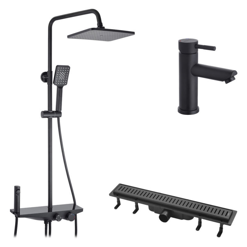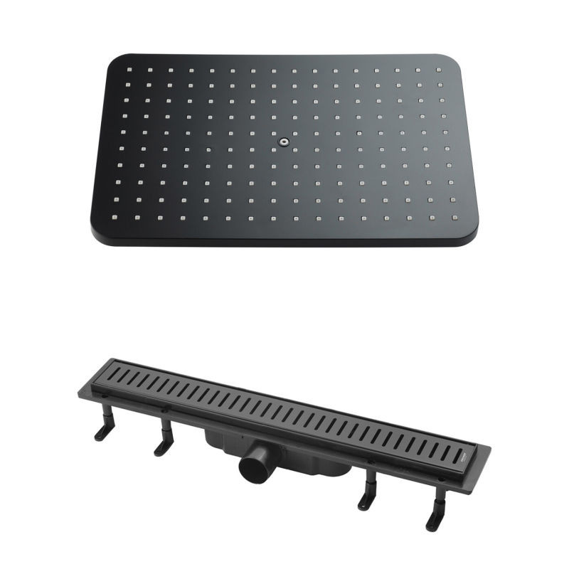 Комплектація Змішувач, гнучка підводка, кріплення, інструкція. Змішувач, душова стійка, лійка з кронштейном для верхнього душу, лійка з кронштейном для ручного душу, душовий шланг, гігієнічний душ зі шлангом. Трап з гратами, ніжки.