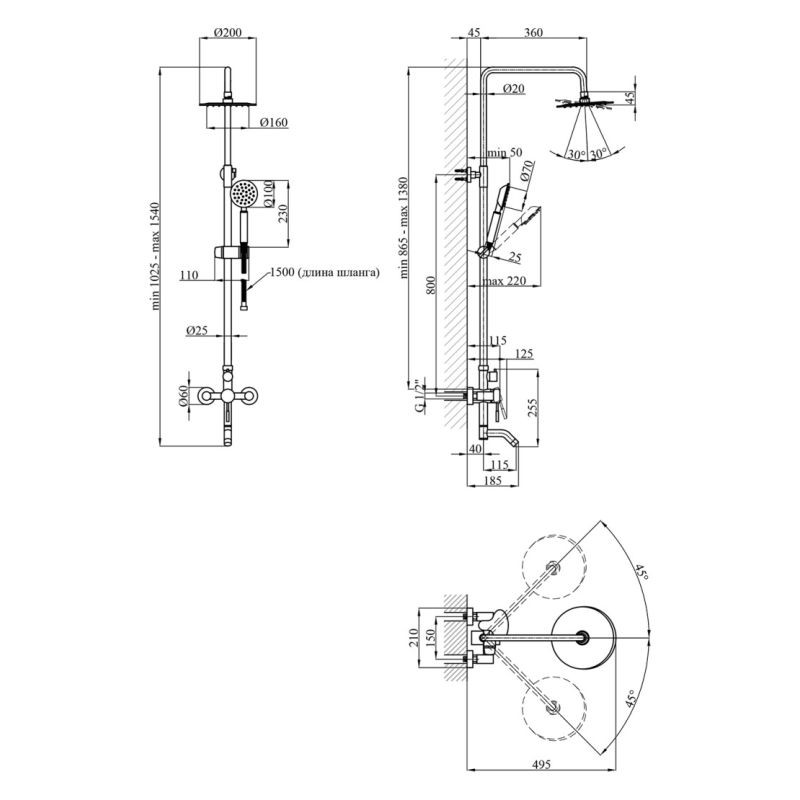 Довжина душового шлангу, мм 1500