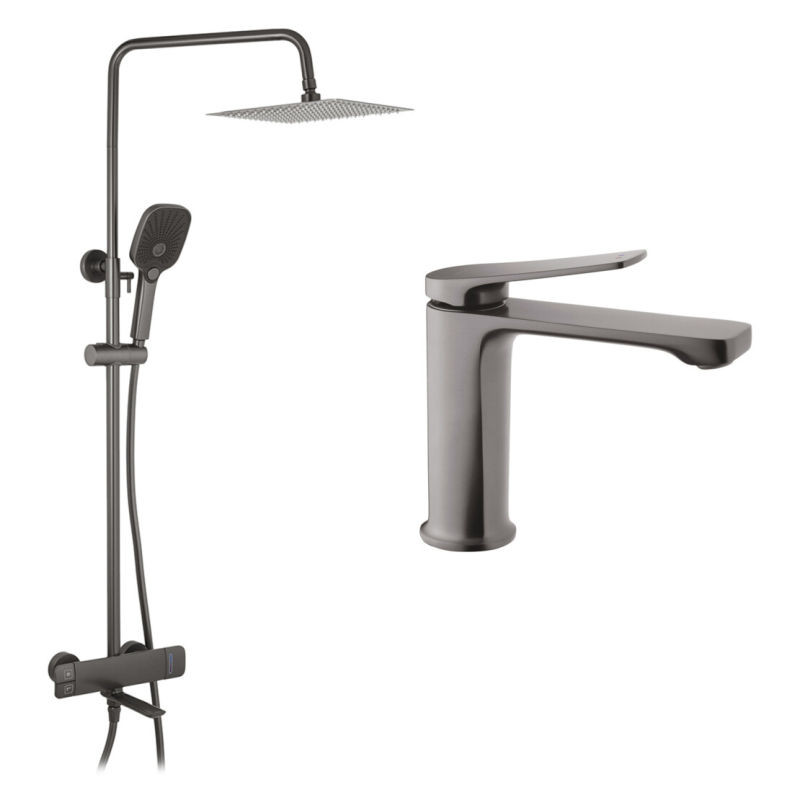 Комплектація Змішувач, стійка, кронштейн для верхнього душу, лійка для верхнього душу, кронштейн для ручного душу, лійка для ручного душу, шланг, кріплення. Змішувач, гнучка підводка, кріплення, інструкція.