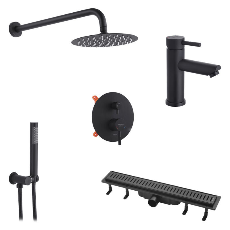 Комплектація Змішувач, кронштейн для верхнього душу, лійка для верхнього душу, кронштейн для ручного душу, лійка для ручного душу, душовий шланг, кріплення. Змішувач, гнучка підводка, кріплення, інструкція. Трап з гратами, ніжки.