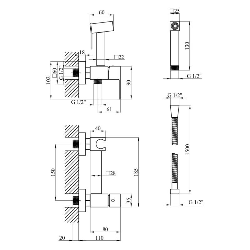 Одноважільне управління з керамічним картриджем 25 мм дозволяє точно і плавно регулювати температуру і напір води. У комплект входить зручна гігієнічна лійка і шланг довжиною 1500 мм (підключення 1/2”), що робить використання максимально комфортним.