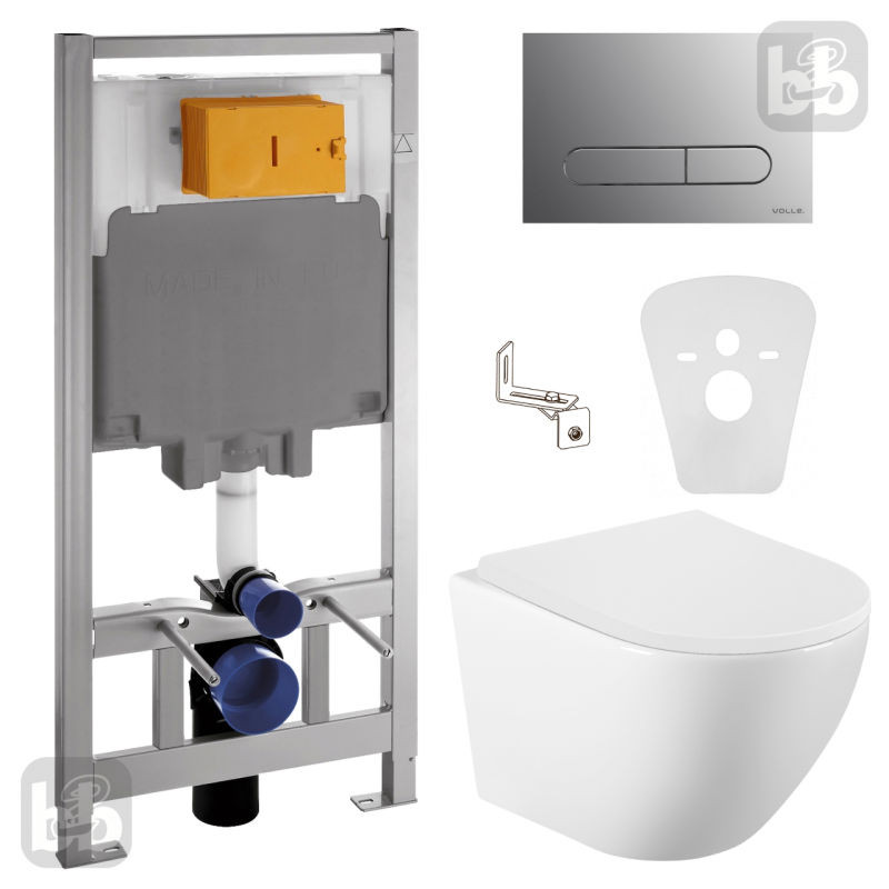 Інсталяція VOLLE MASTER 4 в 1 (141515) гарантує надійність монтажу, економію простору та сучасний вигляд. У комплекті є все необхідне: інсталяція, звукоізоляційна прокладка, унітаз, сидіння та стильна хромована клавіша з глянцевою поверхнею.