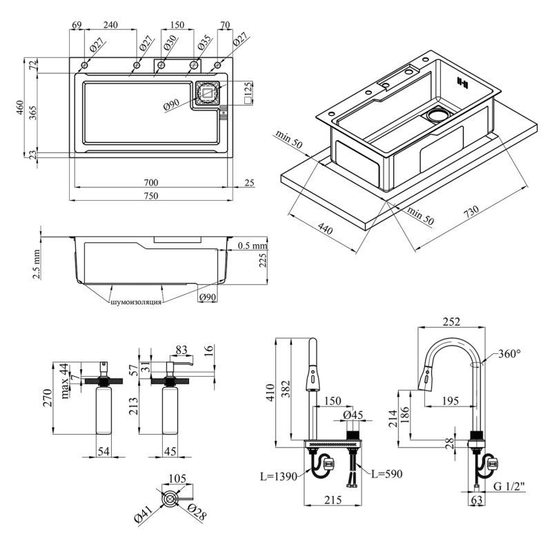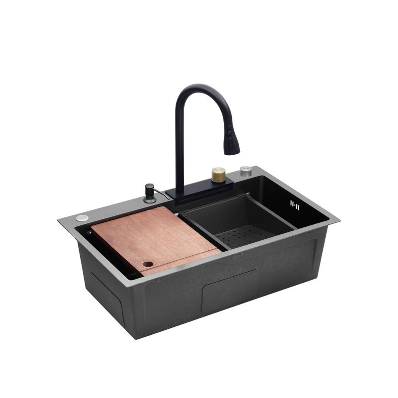 Змішувач з висувним виливом: Має 3 режими та функцію водоспаду. Управління термостатичним картриджем полегшує використання. Ліва сторона керує змішувачем, а права - панеллю з водоспадом. Можна зручно мити фрукти та овочі за допомогою унікального водоспаду.