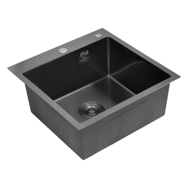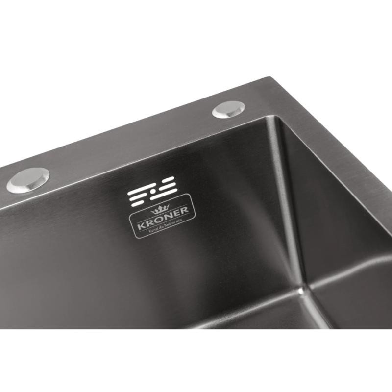 Кухонна мийка Kroner KRP Schwarze - 4545HM PVD (3.0/1.0 мм) - ідеальне рішення для сучасної кухні. Завдяки своїй прямокутній формі та стильному дизайну вона впишеться в будь-який інтер'єр. Інтегрований спосіб монтажу дозволяє безпроблемно встановити мийку. Виготовлена з високоякісної нержавіючої сталі. Практичне доповнення — вбудований отвір для дозатора миючого засобу. Функціональна, надійна та естетично приваблива — мийка від Kroner стане незамінним помічником у приготуваннях та прикрасою вашої кухні.
