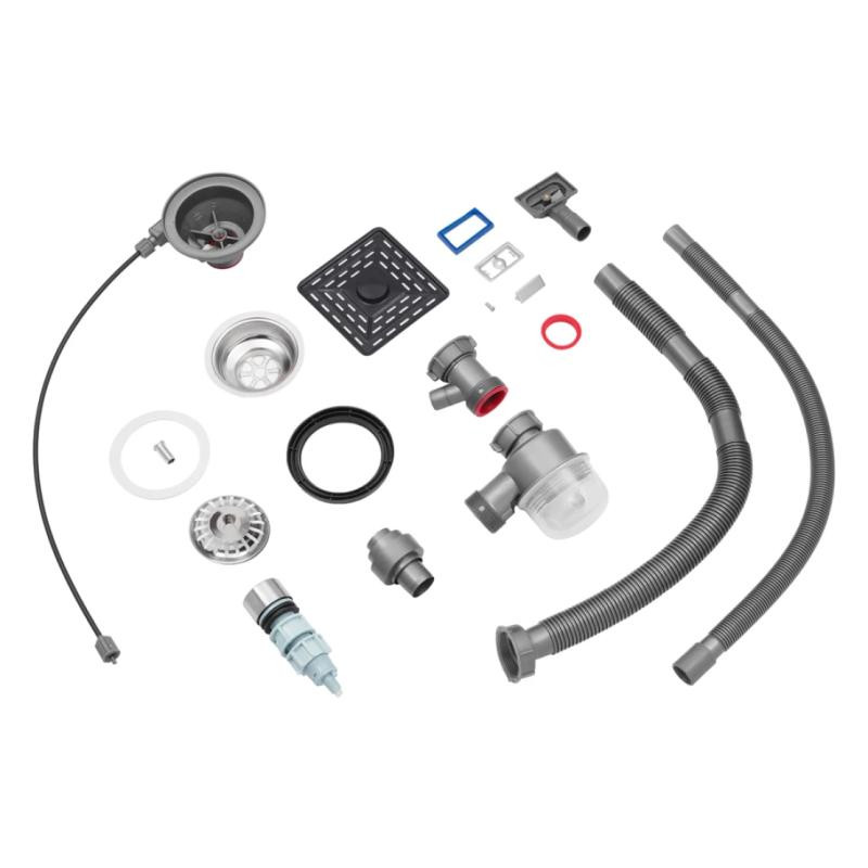Комплектація Мийка, змішувач, обробна дошка, коландер, піддон для овочів, дозатор для миючого засобу, зливна арматура, сифон, кріплення.
