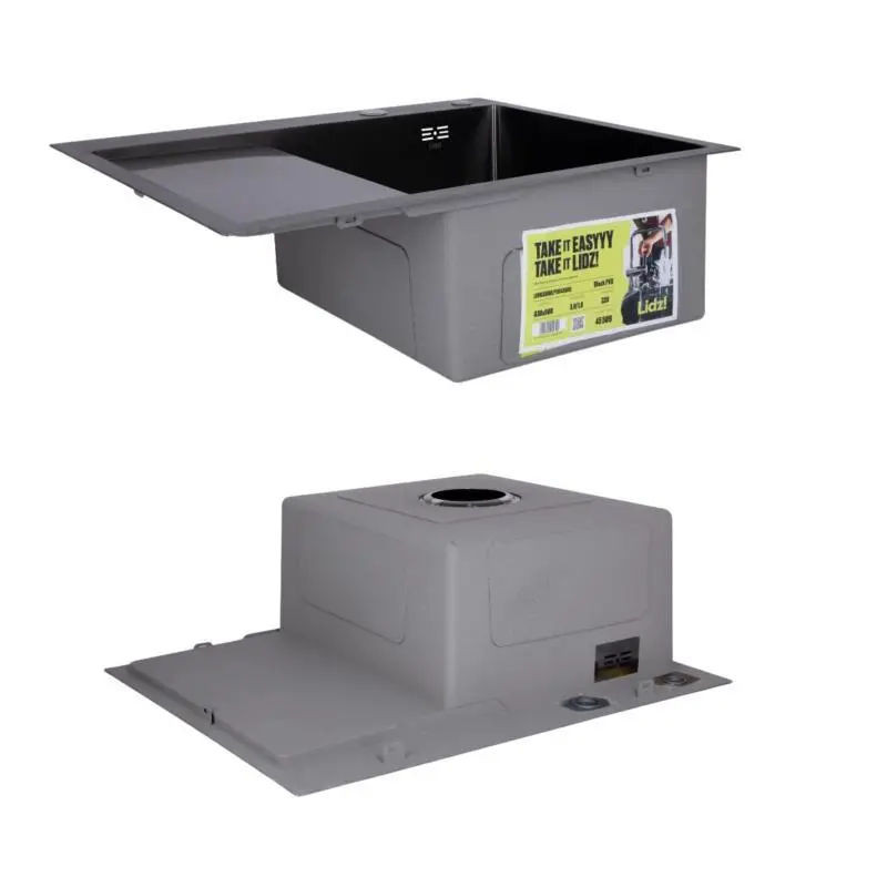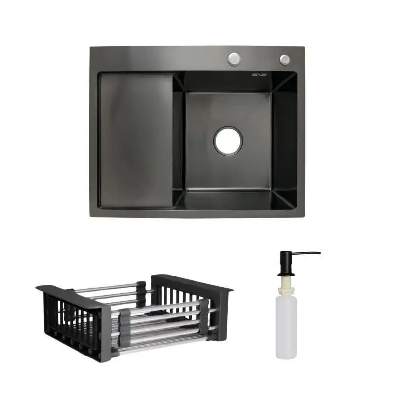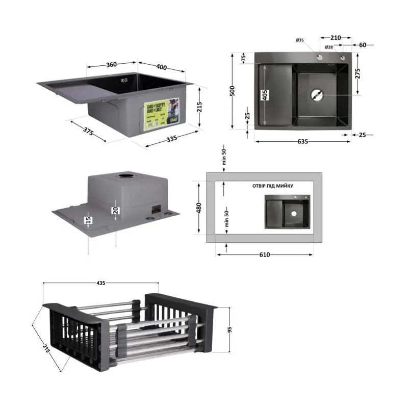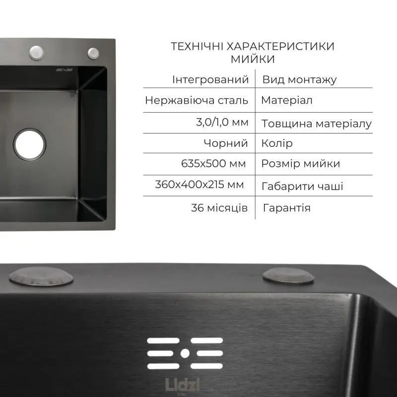 Комплект Lidz Handmade H6350BL (BlackPVD) поєднує чорну мийку з лівим крилом, дозатор і кошик Lidz K01B, додаючи функціональності та елегантності кухонному простору.