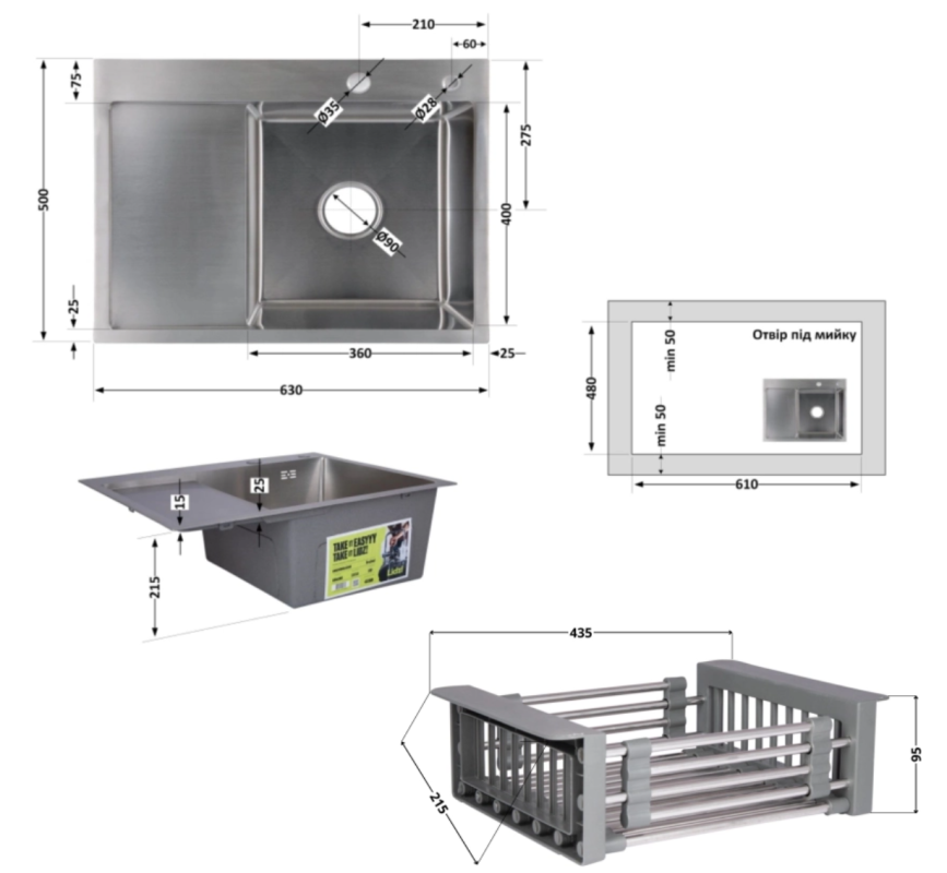 Комплект Lidz Handmade H6350L (Brushed) створений для шанувальників функціональності: інтегрована мийка з лівим крилом, дозатор для мийного засобу та кошик Lidz K01G - все, що потрібно для комфорту.