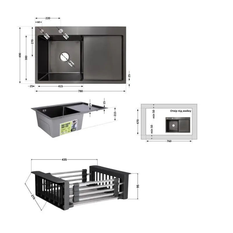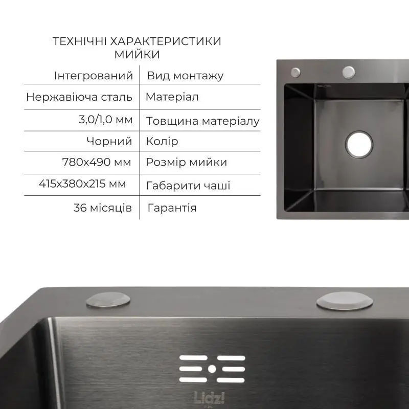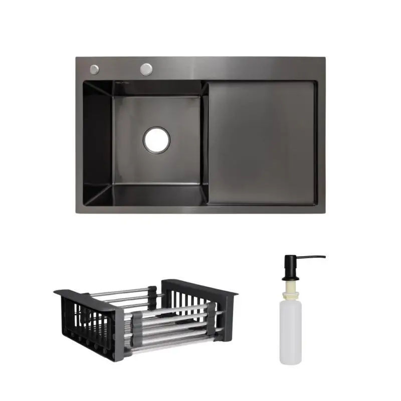 Комплект Lidz Handmade H7849BR (BlackPVD) пропонує простору чорну мийку з правим крилом, дозатор і кошик Lidz K01B, забезпечуючи зручність і красу.