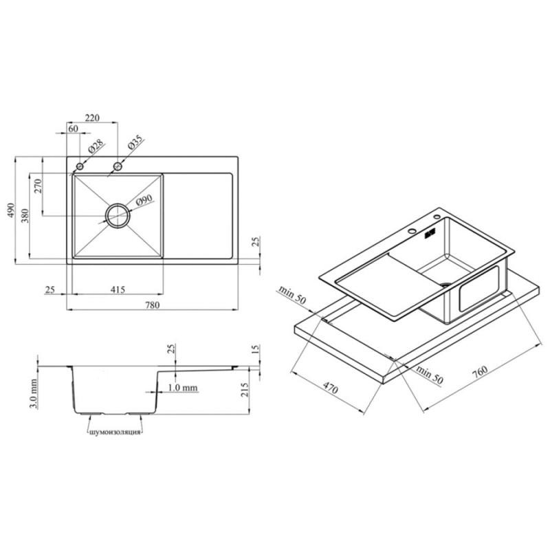 Кухонна мийка Lidz Handmade H7849R крило праворуч (LDH7849BRUR45591) Brushed Steel 3,0/1,0 мм характеристики:
