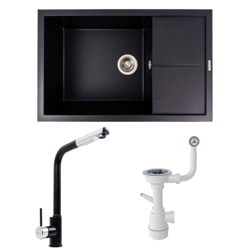 Мийка гранітна 7950 CALYPSO VALESO + Змішувач Q411MB + Сифон (Чорний)
