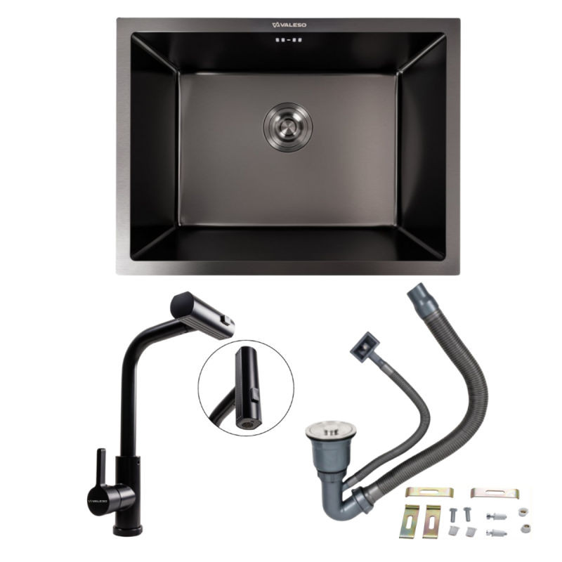 Кухонний комплект: Мийка Valeso Handmade (58x43 см) PVD чорна, монтаж під стільницю + Змішувач XK09B PVD