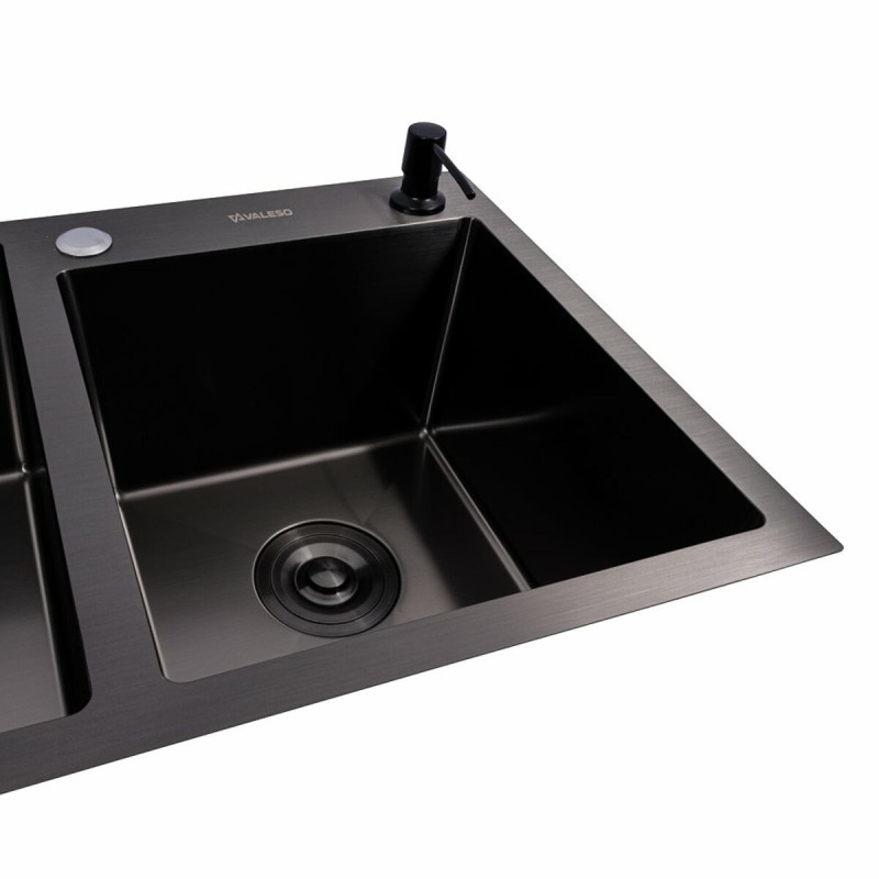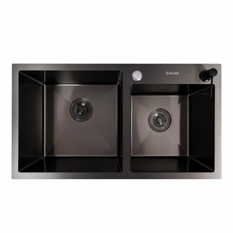 Опис Кухонна мийка Valeso Handmade 78x43 дві чаші PVD чорна (3.0/0.8)