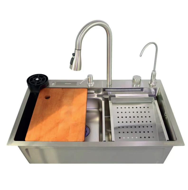 Комплектація змішувач з висувною лійкою. Омивач для склянок. Сифон із напівавтоматичним регулюванням. Кран для подачі питної води. Дерев'яна дошка для нарізки. Дозатор для миючого засобу. Два кошики для промивання та сушіння.