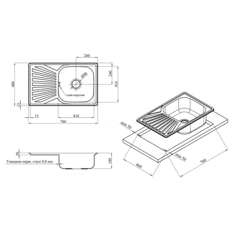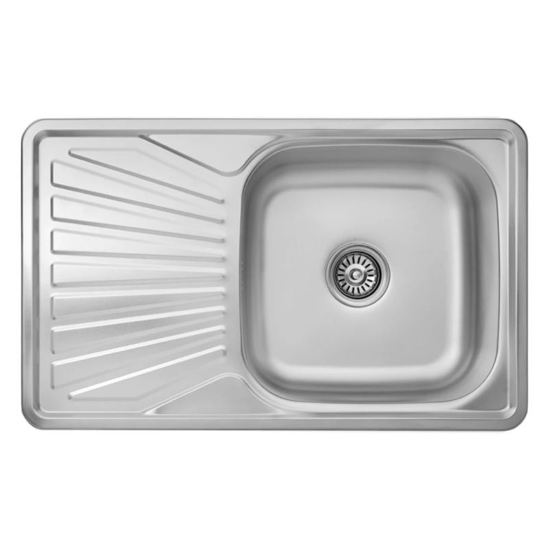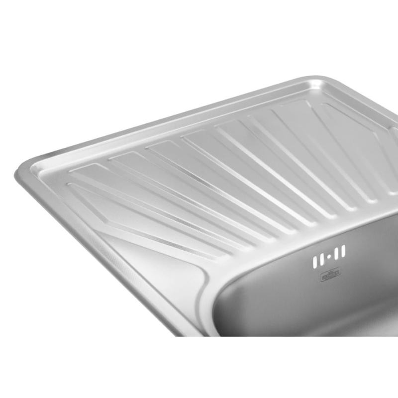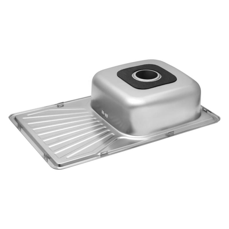 розміром 78х48 см виготовлена з нержавіючої сталі товщиною 0,8 мм. Мийка врізна і встановлюється на стільницю. Мийка має крило, яке можна розміщувати ліворуч або праворуч, так як мийка обертається. Прекрасне рельєфне покриття не вбирає запахи, стійке до механічних пошкоджень і легко миється. Завдяки глибині 18 см і просторим розмірам чаші ви легко зможете мити в ній великий посуд або набирати воду у високі каструлі.