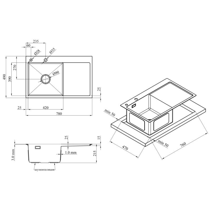 имеет прямоугольную форму с размерами 78х49 см и матовую поверхность. Большая просторная чаша скомбинирована с крылом на котором можно сушить посуду. Чаша размещена справа и над ней предусмотрены отверстия для смесителя и дозатора моющего средства. Мойку можно устанавливать несколькими способами: на столешницу, в один уровень со столешницей и под столешницу. Дно мойки имеет углубление к сливу в виде граней, что обеспечивает полное стекание и меньшее образование пятен от высохшей воды. На внешней стороне мойка имеет специальное звукоизолирующее покрытие, которое минимизирует шумы от струи воды. Мойка укомплектована сифоном с корзинчатым сливом и донным клапаном оригинальной формы.