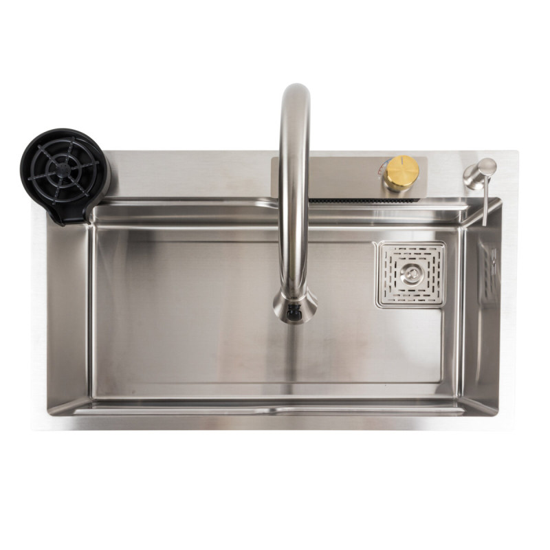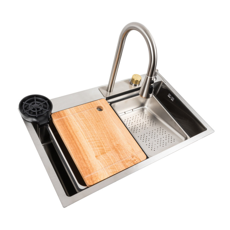 Кухонна мийка 75*45B PVD сатин Platinum Handmade "ВОДОСПАД" - неймовірно популярна кухонна мийка, справжнє відкриття цього року! Її багатофункціональність і комплектація зі змішувачем роблять її незамінним аксесуаром для будь-якої кухні.