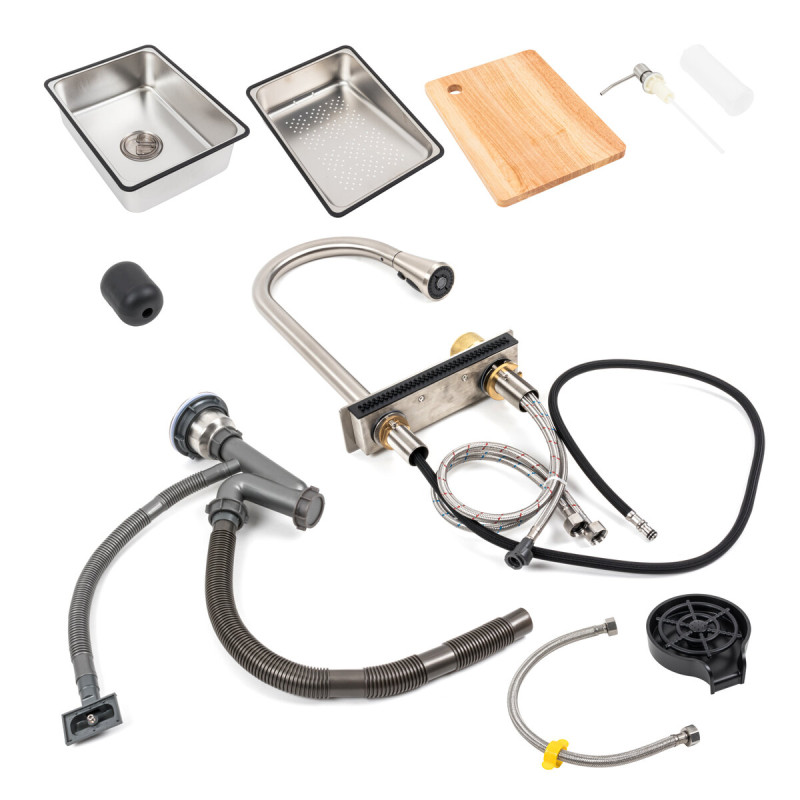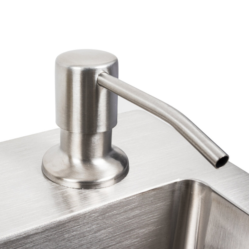 Накладна мийка має стильний хромовий колір, а змішувач з гнучким виливом та дворівневим ступінчастим дизайном може бути переміщений праворуч або ліворуч всередині миття, що дозволяє економити воду, час та зусилля. Глибока і простора раковина дозволяє розмістити каструлі без бризок і легко впоратися з миттям столових приладів.