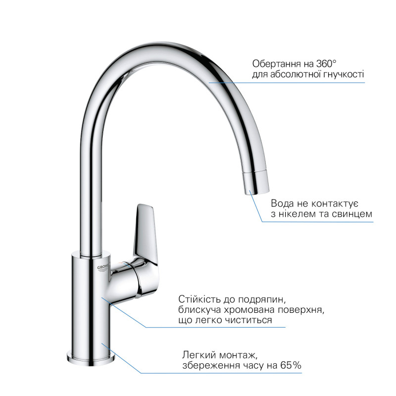Суцільний металевий важіль ергономічний і надійний, а всередині керамічний картридж GROHE LongLife забезпечує точний і надійний контроль потоку та температури води. Внутрішні водні канали GROHE Zero означають, що ваша питна вода не контактує з свинцем та нікелем, а система легкого встановлення з гнучкими з’єднувальними шлангами робить установку цього кухонного змішувача швидкою та безпроблемною. Цей кухонний змішувач, представлений у приголомшливому довговічному хромі GROHE StarLight, збереже свій ідеальний блиск протягом багатьох років використання.