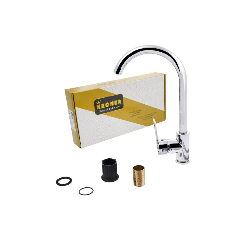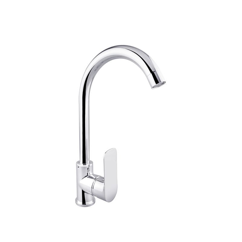 з поворотним виливом виготовлений із силуміну та має хромовану глянсову поверхню. Завдяки своєму високому виливу ви з легкістю можете мити габаритний посуд, набирати воду у високі вази та каструлі з великим комфортом. Змішувач встановлюється на 1 отвір і підключається за допомогою гнучких шлангів, що входять до комплекту постачання.