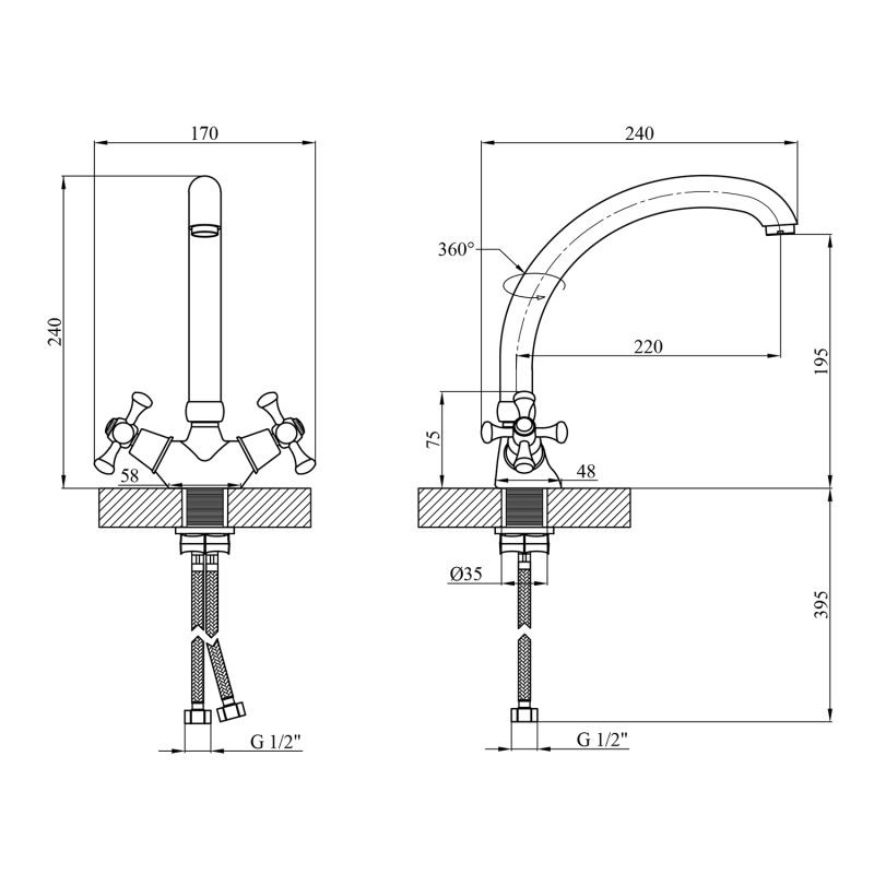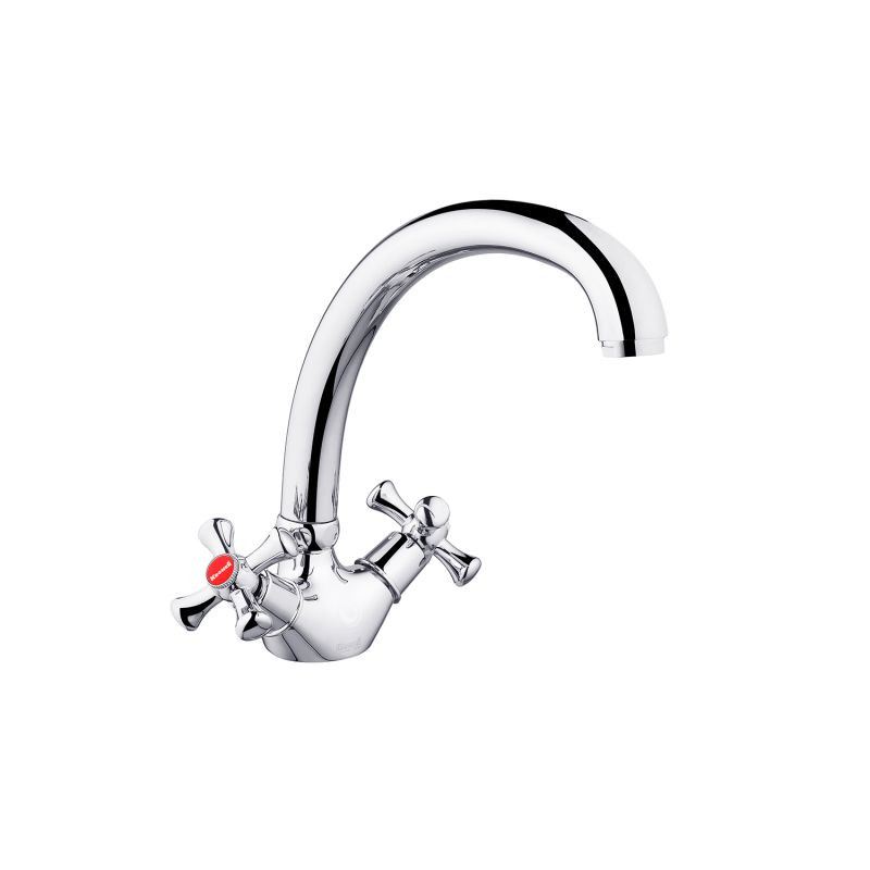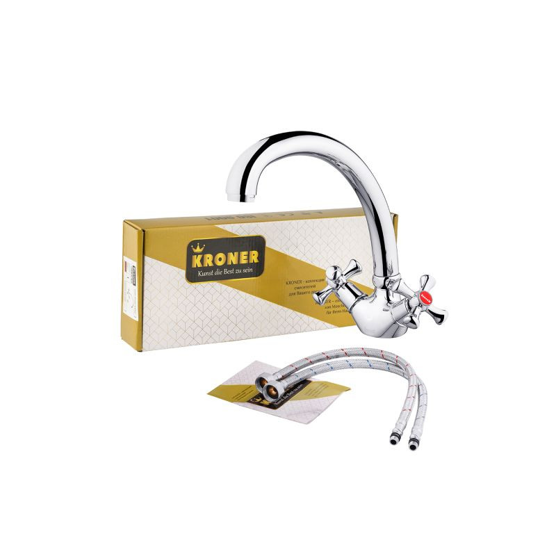 Змішувач для кухні Kroner KRM Rhein-C032 CV017352 виготовлений із силуміну та має хромоване покриття. У змішувача є поворотний високий вилив та класичні хрестоподібні ручки. Завдяки керамічним кран-буксам налаштування температури та напору води буде легким та швидким. Змішувач встановлюється на один отвір і підключається гнучкими шлангами, що входять до комплекту постачання.